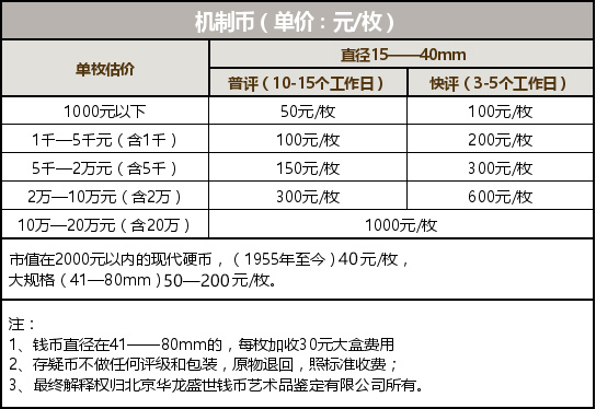 本次調(diào)整價(jià)格由2017年1月1日起開(kāi)始執(zhí)行,2017年1月1日前送評(píng)的錢(qián)幣,均按照2016年收費(fèi)標(biāo)準(zhǔn)進(jìn)行收費(fèi)。